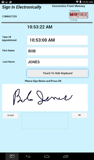 Sign In Electronically is a TABLET application designed to send image and text data to a Windows Application from an Android, IOS, Windows, HP and MAC tablets. The current version is not size able and MUST be run on an Android 7 Inch Tablet. The application is designed to capture an appointment time, first and last names and a signature image. The application is very simple to operate. A connection is required and all fields must be filled in before the "OK" button is activated for transmission to the Windows Application.