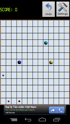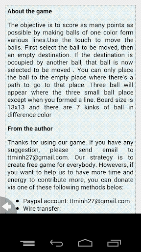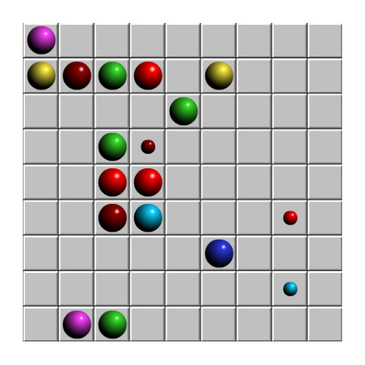 The objective is to score as many points as possible by making balls of one color form various lines.Use the touch to move the balls. First select the ball to be moved, then an empty destination. If the destination is occupied by another ball, that ball is now selected to be moved .