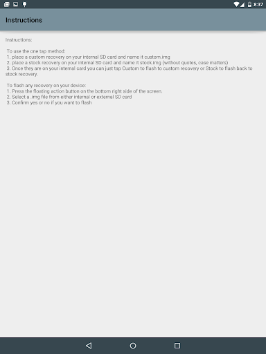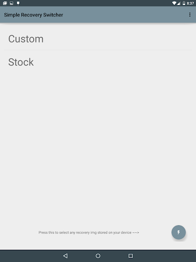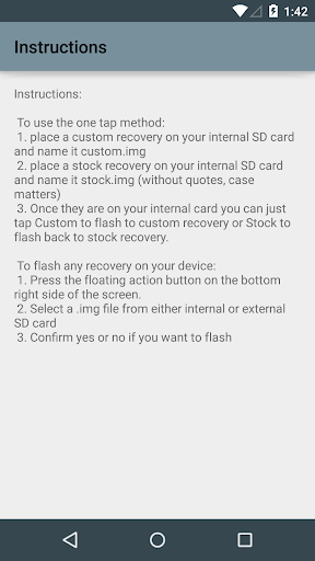 This app will allow you to switch recoveries simply. There are two ways to flash using the app. The one tab method will switch between a custom and stock recovery on your sd card and the other way is to flash any recovery stored on your device. Please see instructions below.
