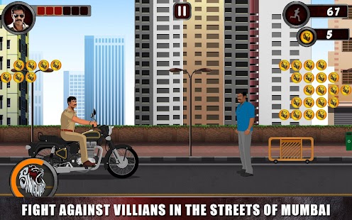 Get ready to go on a hero’s adventure as you run through the streets of Mumbai. Jump over obstacles, flip cars, ride a Bullet and bash enemies into the ground to become the unstoppable force of justice in this free, fast paced, action adventure game. Immerse yourself in stunning environments of Mumbai city as you journey through from suburbs to the city hunting down crime. Throw briefcases, baskets and even coconuts at enemies or whip them with your Police Belt to sweep away evil from your beloved city.