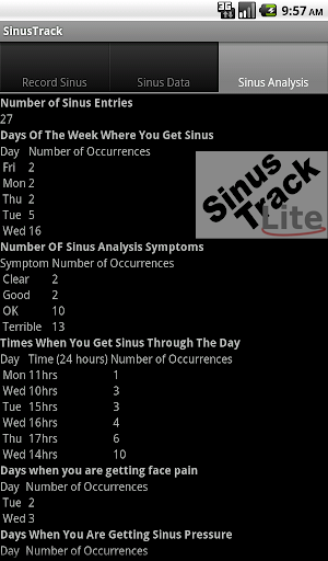 When you have sinus, record how bad and how it affects you in SinusTrack after a a few weeks of recording when you have sinus, you may see a pattern as to when you are getting sinus, such as the times and the days you are getting sinus. This is the Lite version which allows you to store up to 20 sinus episodes SinusTrack the full version is unlimited.