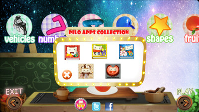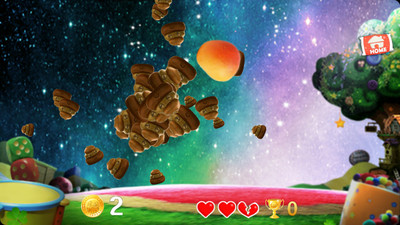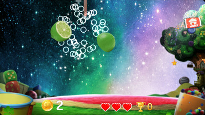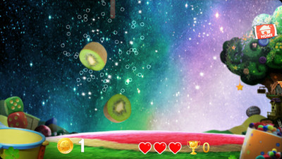 选择水果后,水果会飞到PILO的梦境中的天空中。切水果时会出现积分和听到英语单词发音。在屏幕左下角可以看到积分和心形的最高分(奖杯)。