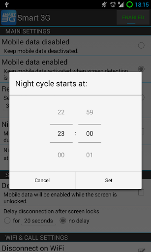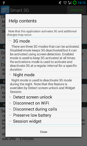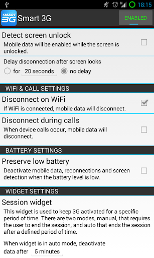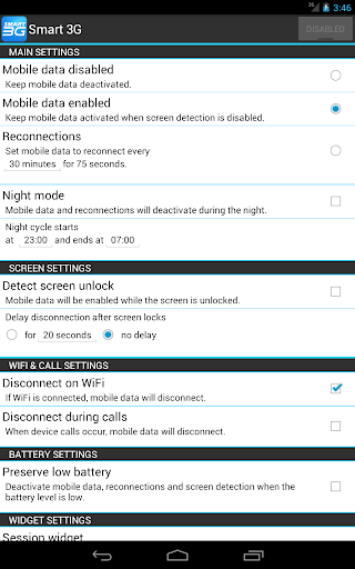 Smart 3G is a manager that allows you to control mobile data in your own way. It saves battery and reduces the emitted radiation from your device. Sync your data and emails automatically by using re-connections at a specified interval and deactivate 3g during the night. Track your screen state in order to activate 3g on screen unlock and deactivate it when screen turns off. The manager can automatically detect when you connect/disconnect to a WiFi network in order to deactivate/activate 3g. Feel free to report any bugs!