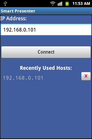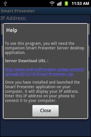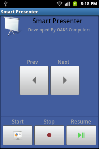 Smart Presenter will allow users to operate their slides using android app over WiFi smoothly. with Smart Presenter user can navigate among his slides using his android smartphone. supported operations includes moving to the next or previous slide, stop presentation, resume presentation and start the presentation from the beginning. In order to use this app user will also need to install the server side application. user can start or stop the server in a single click, no need for long installation process.