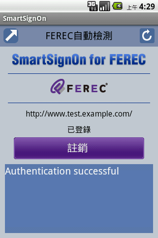 SmartSignOn for FEREC是訪問內網的Web驗證網關「FEREC」的一個客戶端應用程序。首次使用SmartSignOn for FEREC時,只需要輸入一次iPhone或iPod touch中已存在的賬號的信息,下次使用時,只需要通過one-touch就可進行簡單的驗證。也就是說智能手機在進入睡眠的模式後重新驗證時避免了再次輸入用戶名和密碼的麻煩。而且可以防止輸入時「被窺視」(洩露帳號信息)。