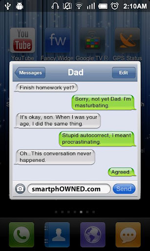 SmartphOWNED AutoCorrect Fails is an app that lets you randomly find a lot of funny smartphone (specially iPhone) autocorrect fails, parental fails, and other fun text conversations from the largest autocorrect screenshot website SmartphOWNED.com . You can click the image to get another random image from the server. Some of them might be real and some of them might be fake, but no matter what, most (more than 98%) of them are funny. I hope you guys will like this application and rate/comment. SmartphOWNED is a site similar to Damn You Auto Correct ( DYAC ), Damn LOL etc. Might be misspelled as SmartPhoned. You will also be able to save the images to your SD Card.