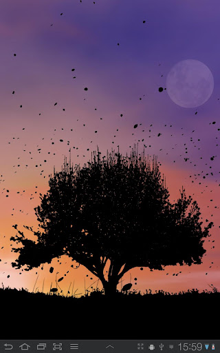 Spring flowering trees that gently sway while petals fly in the air carried by the wind. Clouds and the sun move over the sky that shifts color dynamically according to the time of day. As the night slowly falls the moon appears clearer and clearer until fully visible at midnight. The day starts with a dazzling sunrise around 6 am by the lower left corner and ends with a magnificent sunset in the other corner around 6 pm. You can also adjust sunrise and sunset times according to your own taste.