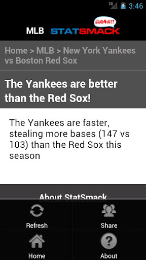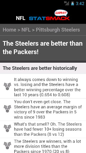 StatSmack is THE ultimate sports trash talk app. Created by the gurus at StatSheet, StatSmack is an educational tool...for your friends. We all have "friends" that root for inferior teams. The StatSmack application leverages StatSheet’s database of over 2 billion statistics to arm you with statistical data that will empirically show that your favorite team is better than any other team on the planet. We have StatSmack apps for the NFL, MLB and NCAA DI Basketball. Just pick your team and then the team you want to destroy and get ready to infuriate your NFL, MLB or NCAA Basketball enemies with irrefutable smack talk!