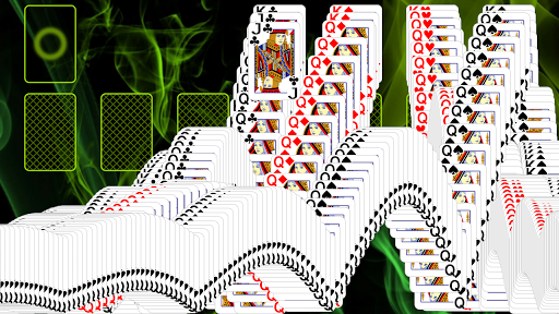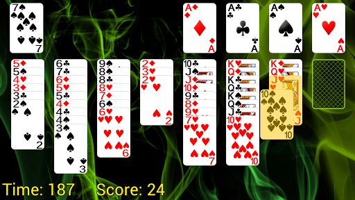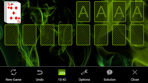 Use all the cards to complete the Foundations, build each one in suit from A to K. Move cards from the Stock to the Tableau. Any card may be played to any pile, but cannot be moved once placed. Only Ace can be moved to the Foundation until the Stock is empty. Once all cards are played, cards may be moved to the Foundations