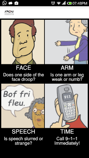 This app shows the signs of a stroke in simple easy graphics. If you or someone else is having a stroke this app will call 911 directly and instantly send text messages to as many as 3 emergency contacts notifying them that you are having a medical emergency and calling 911.