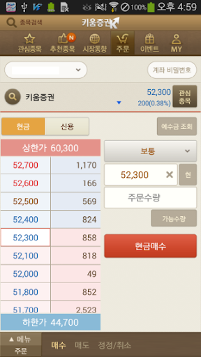 ‘모바일 이용신청’이 된 경우에만 주식 주문이 가능합니다.