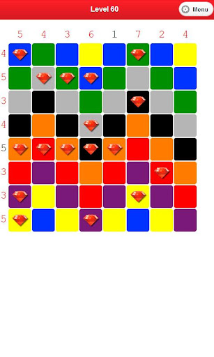 The object is simple: place gems on a board with 64 tiles and 8 colors so that the number of gems in each column and row match the numbers on the top and side of the board. You've heard this before? Well, there's one more tiny detail; every color must contain exactly four gems. There are hundreds of puzzle games that rely on the number three. You know what's better than three? Four! It's one better!