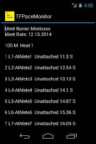 Application also provides up to eight lanes track event time recording and analysis. Meet Name, Meet Date, Run Distance, Heat Number are used as input. Number of athletes and associated Names are then entered or can be downloaded (with appropriate software).