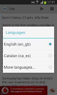 NOTE: Your phone must have a Text-to-Speech enginge for Talk to work. If it doesn't have it you can download it from Google Play. Depending on the TTS engine, some languages that appear in the app may not work.