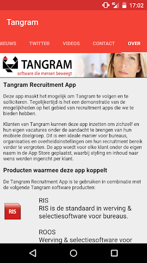 De Tangram Recruitment App maakt het mogelijk om Tangram te volgen en te solliciteren bij Tangram. Het geeft inzicht in het laatste nieuws, social network updates, video's, actuele vacatures en biedt meerdere opties om te reageren.