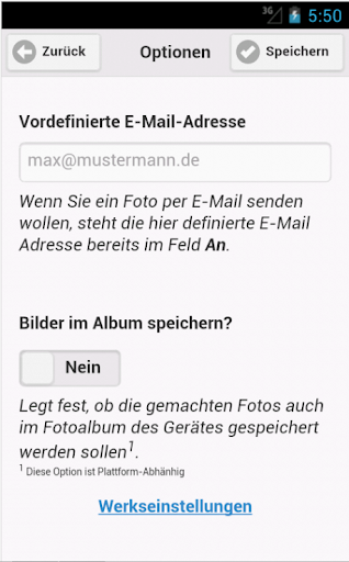 Besonders hilfreich ist diese App, wenn Sie auf Ihrem Gerät kein E-Mail Konto eingerichtet haben, aber trotzdem Fotos per E-Mail versenden möchten.