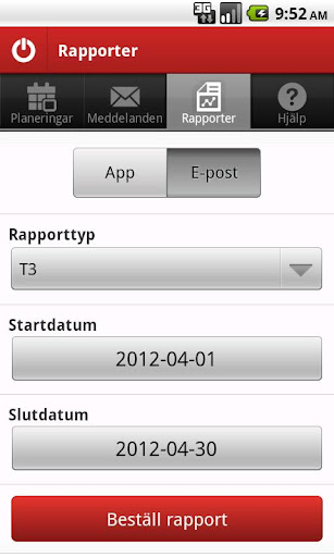 Ladda ner kommande schema eller tjänstgöringsrapport för fritt vald period direkt på appen eller för leverans via e-post. Vrid telefonen till liggande läge för att se rapporten i helskärm.