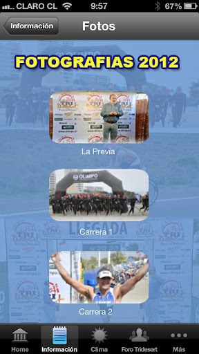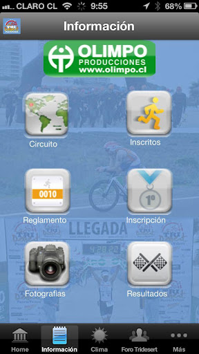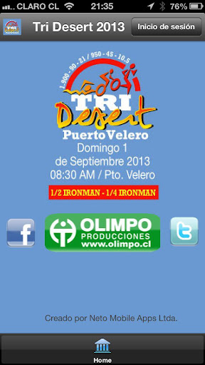 Aplicación para los atletas que participarán en Tridesert 2013. Incluye información del circuito, altimetría, resultados, fotografías, pronóstico de clima, lugares de interés y todo lo necesario para hacer de Tridesert una experiencia inolvidable. Evento organizado por Olimpo Producciones.