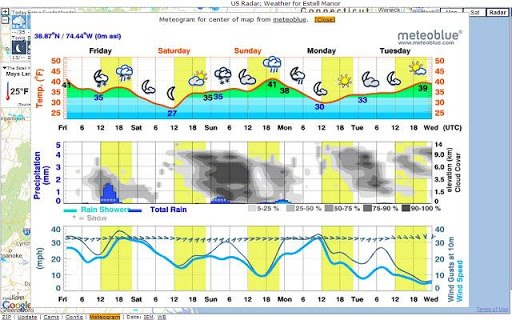 US Weather Radar provides most comprehensive information about the present and future weather conditions via Radar overlays and animation, detailed 8 day and 48h weather forecast, charts, precipitation forecast, alerts, meteograms, cloud overlay, traffic, KML overlay support for additional information and much more.