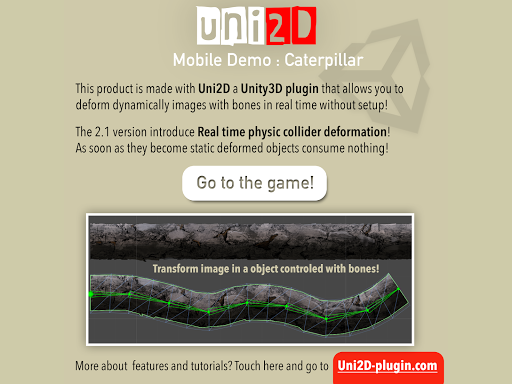Uni2D is a 2D framework. Give life to any drawings by bending them any way you want using bone deformation. Just drag and drop any image to create accurate dynamic physical object. The new 2.1 version of Uni2D brings sprite deformation and physics to a new level. Now the physics colliders will take on the realtime deformation too and you can choose to go either with 3d, 2d physics or both!