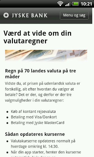 Med Jyske Banks valutaomregner til Android kan du nemt og hurtigt beregne valuta. Du kan også bruge app'en, selvom du ikke er kunde i Jyske Bank.