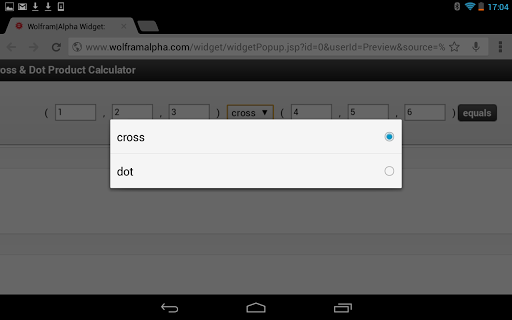 Enter any two vectors and this calculates the cross and dot product, and this generates the solution. It also shows the step by step workings to the solution and basically does just what it says on the tin.