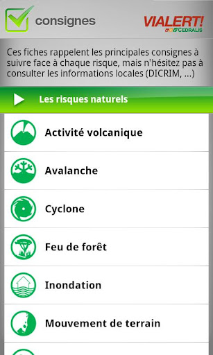 Vous pouvez choisir d'être alerté en fonction de votre position, ou en fonction des différentes adresses fixes que vous aurez sélectionnées (domicile, lieu de travail, résidence secondaire, famille,...). Pour chaque événement vous obtiendrez les consignes officielles sur la conduite à tenir. Vous pouvez également participer aux tests mensuels en saisissant le code "TESTMOIS".