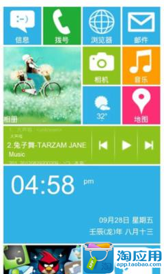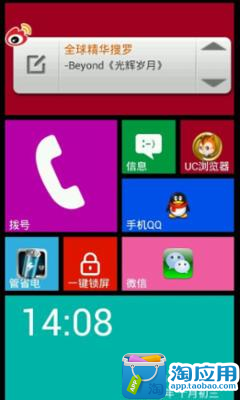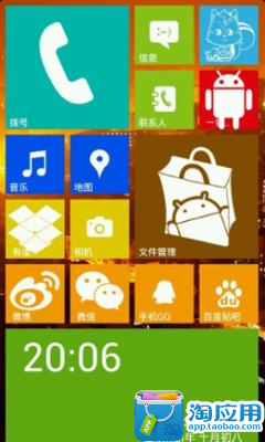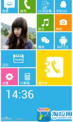 专门为Android系统推出一款Windows Phone 8风格的桌面美化应用,可添加多种大小、颜色、功能等样式的瓷块,定制您完全个性化的开始屏幕,随意Diy,彰显个性,创意无限,带给您新颖的玩机体验。主要功能:可添加多种大小的瓷块;可添加多种颜色的瓷块;可设置上百种主题颜色;支持保存还原主题功能;支持设置当前背景风格;支持设置当前锁屏风格;支持多语言界面功能;支持添加安卓小部件;支持添加安卓快捷方式;支持主屏幕布局编辑;支持切换应用列表风格;自带多个常用应用图标;自带多个特殊功能瓷块;自带Windows Phone 8风格锁屏;