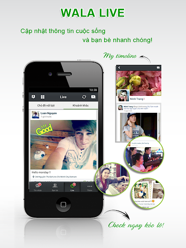 Wala continuously brings you photos from real life topics & events. Wala lets you communicate with your friends using our fast & reliable chat messages: text messages, photos, voice messages ... Wala even let you chat with a group of friends or making new friends using our unique and fun “location chat” and “shake hands”. Even more, you can enjoy other entertaining content on Wala, such as: Games, Movies. All-In-One account!