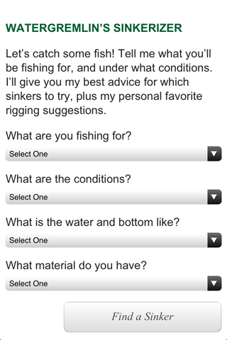 The SINKERIZER™ is an interactive tool designed to help anglers select the best type of sinker for nearly any fishing situation. In the store or on the boat, this application quickly helps you determine the type and size of sinker you need by answering four simple questions. Results include three unique recommendations as well as appropriate rigging from the Gremlin’s classic collection of fishing tips. And best of all, it’s free. Just another small gift from the Gremlin to help give you more time to wet your line.