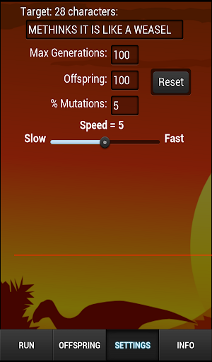 This software app is an evolution simulation based on the evolution program in Richard Dawkins's book, The Blind Watchmaker, that shows the process of natural selection. The program got its name from Dawkins using the phrase from Shakespeare, "METHINKS IT IS LIKE A WEASEL" in the program. The program aims to demonstrate that the preservation of small changes in an evolving string of characters (or genes) can produce meaningful combinations in a relatively short time as long as there is some mechanism to select cumulative changes, whether it is a person identifying which traits are desirable (in the case of artificial selection) or a criterion of survival ("fitness") imposed by the environment (in the case of natural selection). Reproducing systems tend to preserve traits across generations, because the offspring inherit a copy of the parent's traits. It is the differences between offspring, the variations in copying, which become the basis for selection, allowing phrases closer to the target to survive, and the remaining variants to "die."