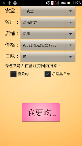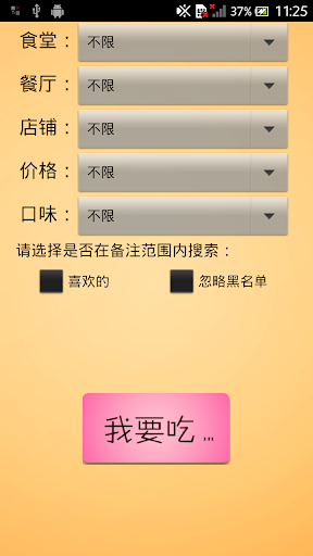 Now suppose you are in the second page, you will face a lot of available conditions for you to choose, but you don’t have to constrain them. IF you do ,we will help select one from those who fit for your given conditions. From the top to the button, the conditions are: canteen, hall, store, price, and taste. Under them are for you to choose whether to select from your favor list and ignore those in your blacklist. After you settle all, you can click on the pink button, and you will get a result and turn into the result page.