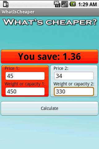 Save your money calculating which product is cheaper. 2-kilo pack of pasta for 2.55$ or 2.5-kilo pack for 3.15$? What's cheaper will tell you how much exactly you will save!