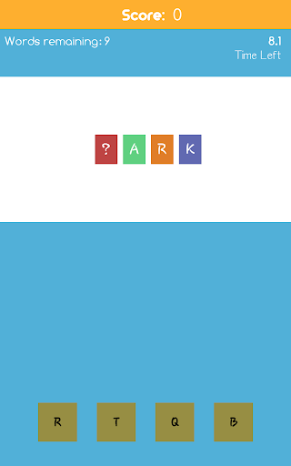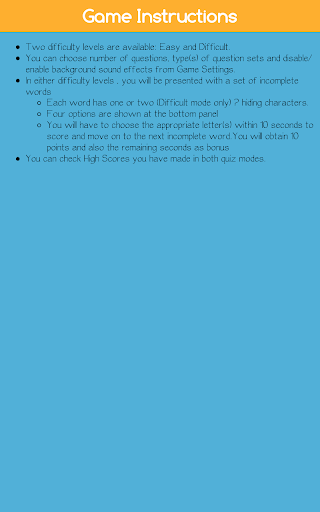 You will have to choose the appropriate letter(s) within 10 seconds to score and move on to the next incomplete word.You will obtain 10 points and also the remaining seconds as bonus