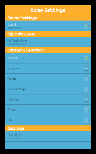 You can choose number of questions, type(s) of question sets and disable/enable background sound effects from Game Settings.