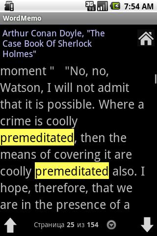 Программа предназначена для удобного чтения англоязычной литературы и заучивания встретившихся незнакомых слов. Её основная идея состоит в следующем: пользователь читает с экрана какой-либо англоязычный текст (например, художественный роман) и если в процессе чтения он встречает новое для себя слово, он может коснуться его пальцем и посмотреть перевод, а также пометить это слово как незнакомое. Все встреченные в текстах слова заносятся в личный словарь пользователя – это позволяет через пару месяцев составить хорошее представление о своём словарном запасе, если регулярно читать. При этом, те слова которые были отмечены как незнакомые, можно заучивать с помощью тренажёров (например, показывается английское слово, и нужно написать его значение на русском, или наоборот).
