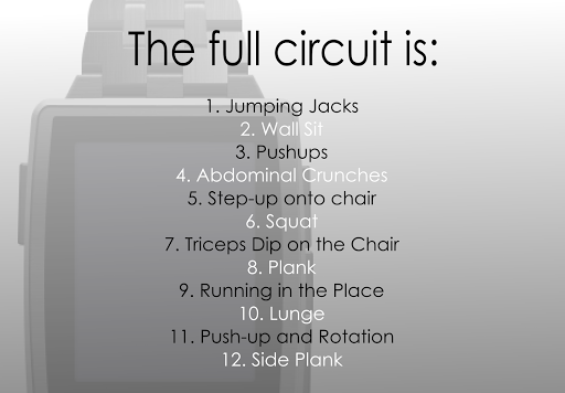 The workout consists out of 12 exercises. You can get into shape in less than 10 minutes a day using SmartWatch, a chair and a wall.