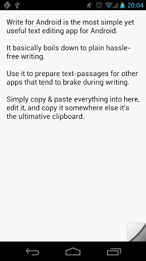 Write for Android stores all your writings safely and remembers the last position you stopped writing. You can just start over where you left off when opening the app next time.
