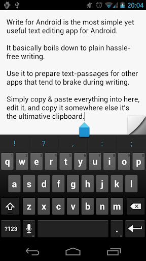 Use the built in copy&paste functions of Android Honeycomb and Ice Cream Sandwich to make the most use out of Write for Android! You can select text passages, cut, copy and paste.