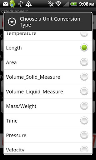 The droidConverter app is a free unit conversion, unit converter, utility (with ads) that allows you to convert many different types of units. It has a very simple interface that allows the user to select the type of conversion that they would like, for example Length. The user then would select the from unit (i.e. Feet) and the unit to which they would like to convert the value to, the to value (i.e. Miles).