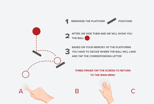 How to play: We're going to show you for 3 seconds the bumpers. It's your job to store their position in your short term memory. After, we hide them and we will show you the red ball. Based on your memory of the bumpers you have to decide where the ball will land.