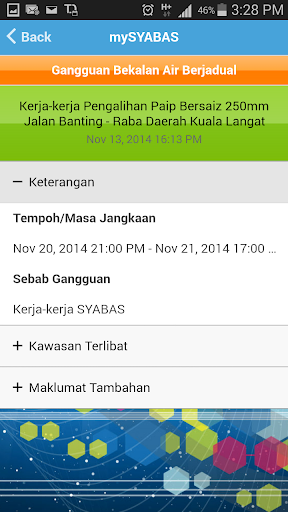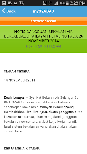 This is an official mobile application from Syarikat Bekalan Air Selangor Sdn Bhd (SYABAS). It is as another information and complaint channel in order to provide better services to water consumers of Selangor, Kuala Lumpur and Putrajaya, in line with todays' technological advancement in Information Technology and Communication. Any complaint submitted through this application will be received instantly by our SYABAS PUSPEL (Consumer Service) team, to authenticate its validity and to ensure the complaint will be attended.