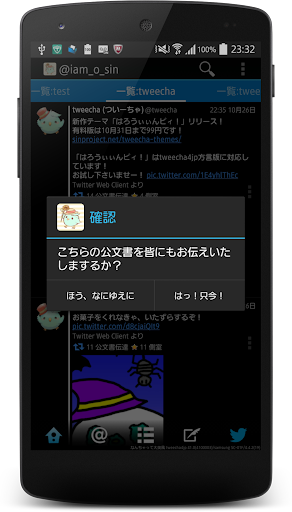 - tweechaPrime4jpはリリースしたばかりですので正常に動作しない可能性があります。予めご了承下さい。動作が安定しない場合は、大変お手数ですがTwitter上のサポート窓口「@tweecha」までご連絡頂けましたら幸いです。