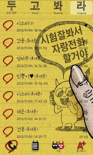 통화목록화면 > 홈버튼왼쪽 > 테마 에서 다운받은 테마를 확인할 수 있으며 설정할수 있는 곳입니다.