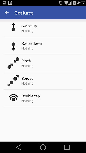 Swipe up, swipe down, pinch, spread and double tap. The list of supported actions for gestures is : Recent Apps, Search, Voice Search, Notifications, Toggle Fullscreen, Default Screen, Overview, Lock/Unlock, Quick Settings, Launcher Settings.