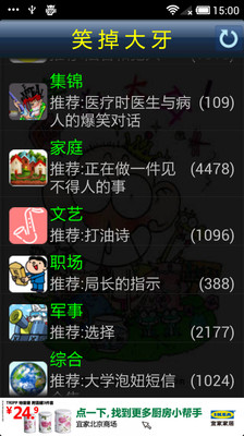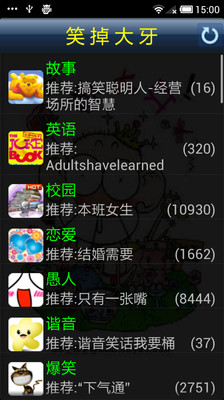 这里有你的笑料工厂,这里有你的笑话天地。《笑掉大牙&极品笑话》收集数十万各类笑料,笑话分类四十余种:夫妻笑话、恶心笑话、爱情笑话、恐怖笑话、家庭笑话、校园笑话、名著笑话、儿童笑话、医疗笑话、愚人笑话、司法笑话、交通笑话、交往笑话、动物笑话、民间笑话、顺口溜、古代笑话、经营笑话、名人笑话、幽默笑话、歌词笑话、体育笑话、宗教笑话、文艺笑话、电脑笑话、恋爱笑话、英语笑话、原创笑话、综合笑话、求爱笑话、趣闻笑话、男女笑话、万荣笑话、军事笑话、冷笑话、国外笑话、现代笑话、职场笑话...丰富您的业余生活,让你全天乐乐呵呵!你还可以把笑话通过短信、邮箱发给你的同学、同事、好友分享分享快乐!您还可以把笑料收藏,以后再重温这快乐的时光,极品笑话每日更新。笑掉大牙,是您休闲娱乐的必备软件.....