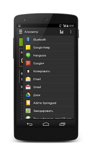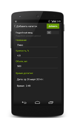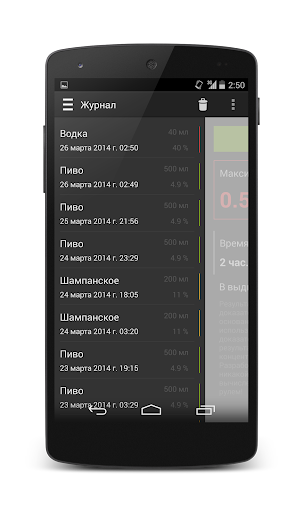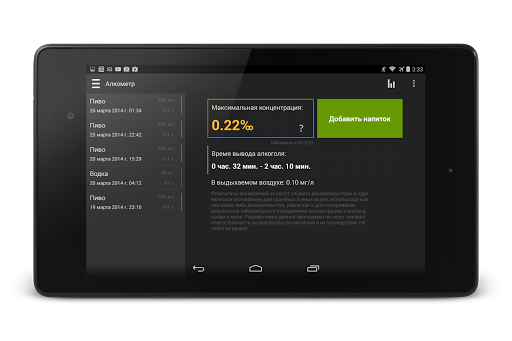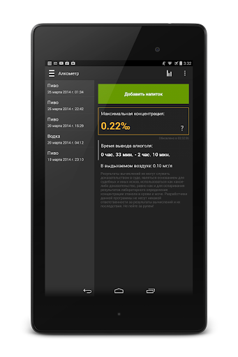 Для удобства в программу встроена история ваших посиделок, а также время вывода алкоголя из крови и возможные нарушения в работе организма и поведении^^. С набором готовых макетов Вы всегда сможете добавить новые сорта алкоголя или изменить уже готовые.