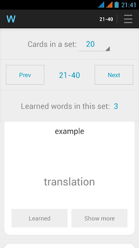 6. Для удобства изучения можно использовать наборы из 20, 50 и 100 карточек (выпадающий список Cards in a set). Для перемещения между наборами используются кнопки Prev (предыдущий набор) и Next (следующий набор). Для информации отображается количество выученных в наборе слов (Learned words in this set).