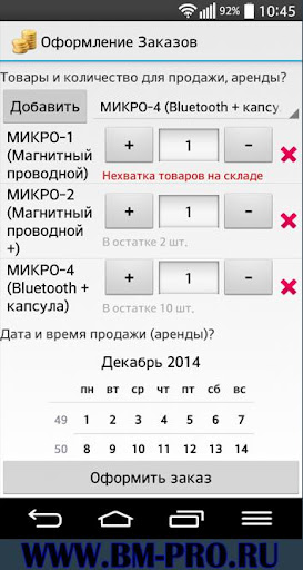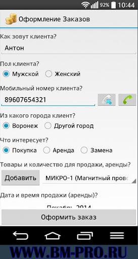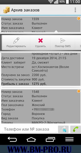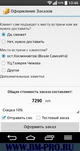 С помощью BM-PRO Вы сможете регистрировать клиентские заказы, вести списки всех клиентов и товаров, взаимодействовать с клиентами по средствам sms уведомлений. Для комфортной работы необходимо использовать не более 100ед. товара. Приложение проводит максимальную автоматизацию заказа от момента его оформления до его завершения. По сути это небольшая CRM+1С система под Android.
