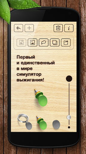 В меню доступен выбор основ для выжигания. Инструментов для выжигания. Доступна загрузка фотографий из фотоальбома для возможности обведения контуров.